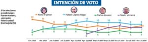En los cuatro primeros puestos no hay mayor variación. Rafael López Aliaga (9%), Keiko Fujimori (8%), Mario Vizcarra (7%) y Carlos Álvarez (4%) repiten la misma ubicación y el mismo porcentaje. Salvo la lideresa de Fuerza Popular que sube un punto respecto del mes de octubre.