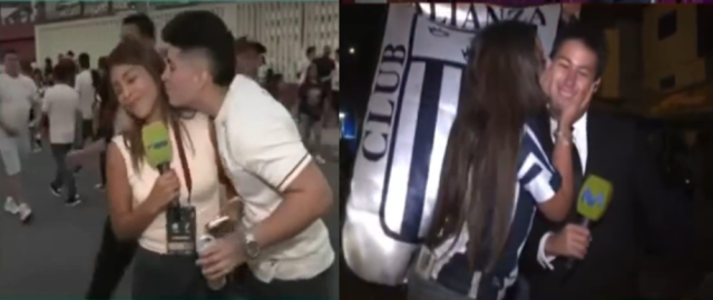 Dos casos, un mismo problema. Lorena Jurupe y Marcelo Merizalde fueron abordados sin consentimiento durante coberturas en vivo. Fuente: Capturas de Movistar Deportes