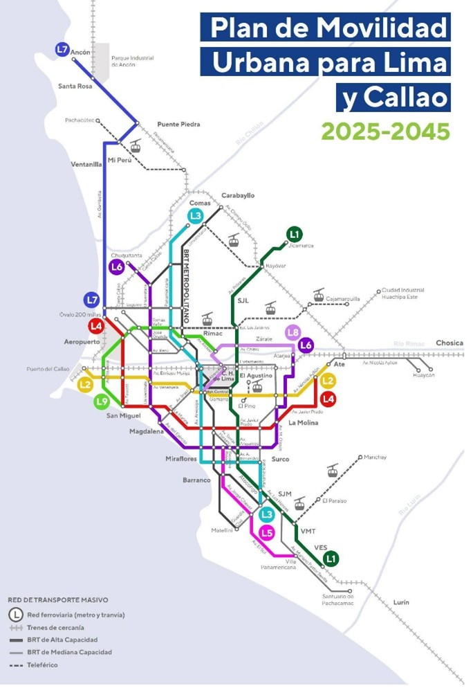 Uno de los pilares del nuevo plan es la expansión del sistema de metro como eje estructurante del transporte masivo. La propuesta contempla una red de nueve líneas de metro hacia el 2045, diseñada para cubrir no solo el núcleo central de la ciudad, sino también los distritos de mayor crecimiento poblacional en Lima Norte, Lima Este, Lima Sur y el Callao.