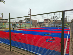 El verde clásico del grass fue desterrado. En su lugar, dos franjas gigantes —azules y rojas— cubrían la loza deportiva como una bandera sin mástil. Para algunos vecinos, el color representaba “alegría y renovación”; para otros, evocaba los tonos del partido político del alcalde.