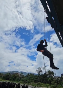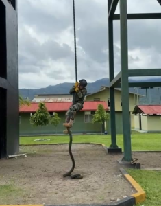 También hay cursos de descensos en rappel o fast rope, maniobras que sirven para insertarse en operaciones helitransportadas. Jeison recuerda haber descendido más de una vez desde un helicóptero, con la soga caliente entre las manos y el peso del fusil golpeando el pecho. A veces, esa es la forma más rápida —y única— de llegar a un punto.