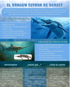 El espécimen pertenece al grupo de los ictiosaurios, reptiles marinos que dominaron los océanos durante el Jurásico temprano. Se estima que el Dragón espada medía cerca de tres metros de largo y poseía un hocico alargado, con dientes finos y afilados para capturar peces y calamares. Su cráneo, conservado en tres dimensiones, permitió a los investigadores reconstruir detalles anatómicos que no aparecen en otros fósiles más fragmentados.
