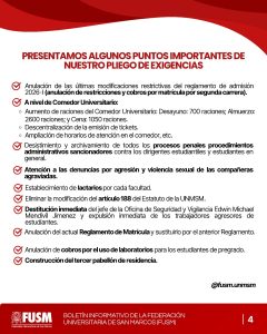 La federación universitaria de San Marcos presento este jueves un pliego con las cosas que deben corregirse dentro de la institución entre ellas la anulación del actual reglamento de matrícula y que no se cobre el uso de los laboratorios a los estudiantes de pregrado, quienes lo usan con frecuencia para sus estudios.