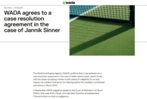 Tajantes. La Agencia Mundial Antidopaje sancionó a Sinner con tres meses de suspensión en 2025. Fuente: AMA