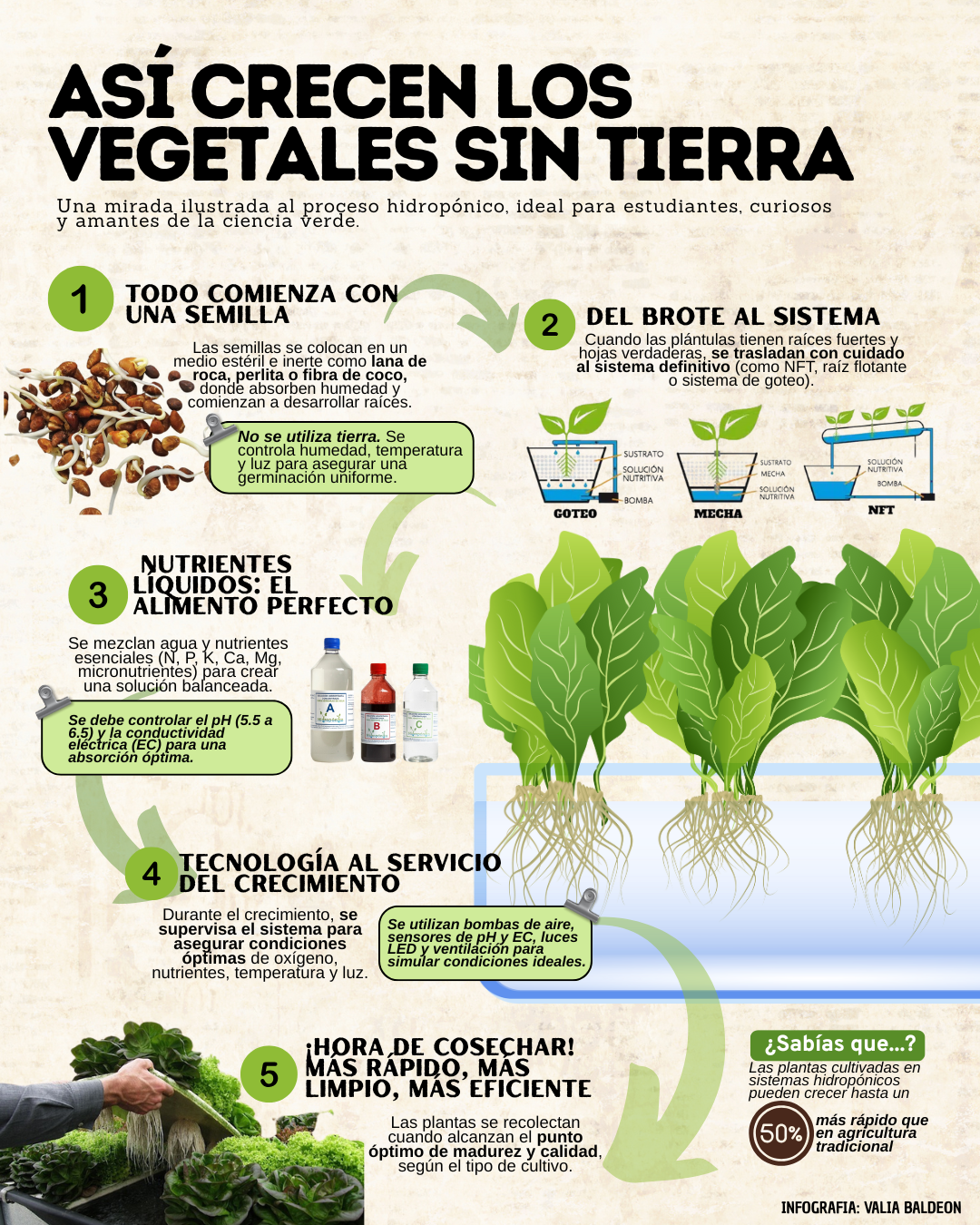 Ahora que ya conocemos qué es la hidroponía y por qué está ganando terreno frente a la agricultura tradicional, es momento de ver cómo se lleva a cabo en la práctica. Detrás de cada hoja cultivada sin tierra hay un proceso cuidadosamente diseñado. Desde la germinación hasta la cosecha, cada etapa cuenta con su propia lógica, tecnología y ritmo. La siguiente infografía desglosa ese proceso paso a paso.