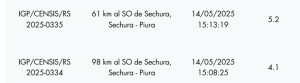 Con solo minutos de diferencia, dos movimientos telúricos fueron registrados en la misma ciudad. Fuente. Instituto Geofísico del Perú.