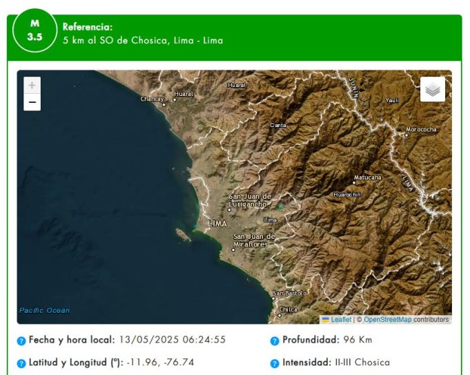 La preocupación no se limita a Chosica. El 14 de mayo, dos movimientos telúricos consecutivos de magnitudes 4.1 y 5.2 sacudieron la costa de Sechura, Piura, con menos de cinco minutos de diferencia, según reportes del IGP. Además, ese mismo día, se registró un temblor de magnitud 4.1 a 63 km al oeste de Ancón, Lima.